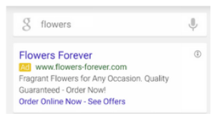 Ao eliminar a segunda linha de texto do anúncio, fornecemos às empresas outro ponto de envolvimento com os clientes nos seus anúncios, neste caso, a extensão de localização adicional. Com um único clique nos respetivos smartphones, os consumidores podem agora interagir diretamente com a Flowers Forever de três formas: podem visitar o Website para dispositivos móveis, efetuar uma encomenda ou obter direções para visitar a loja.